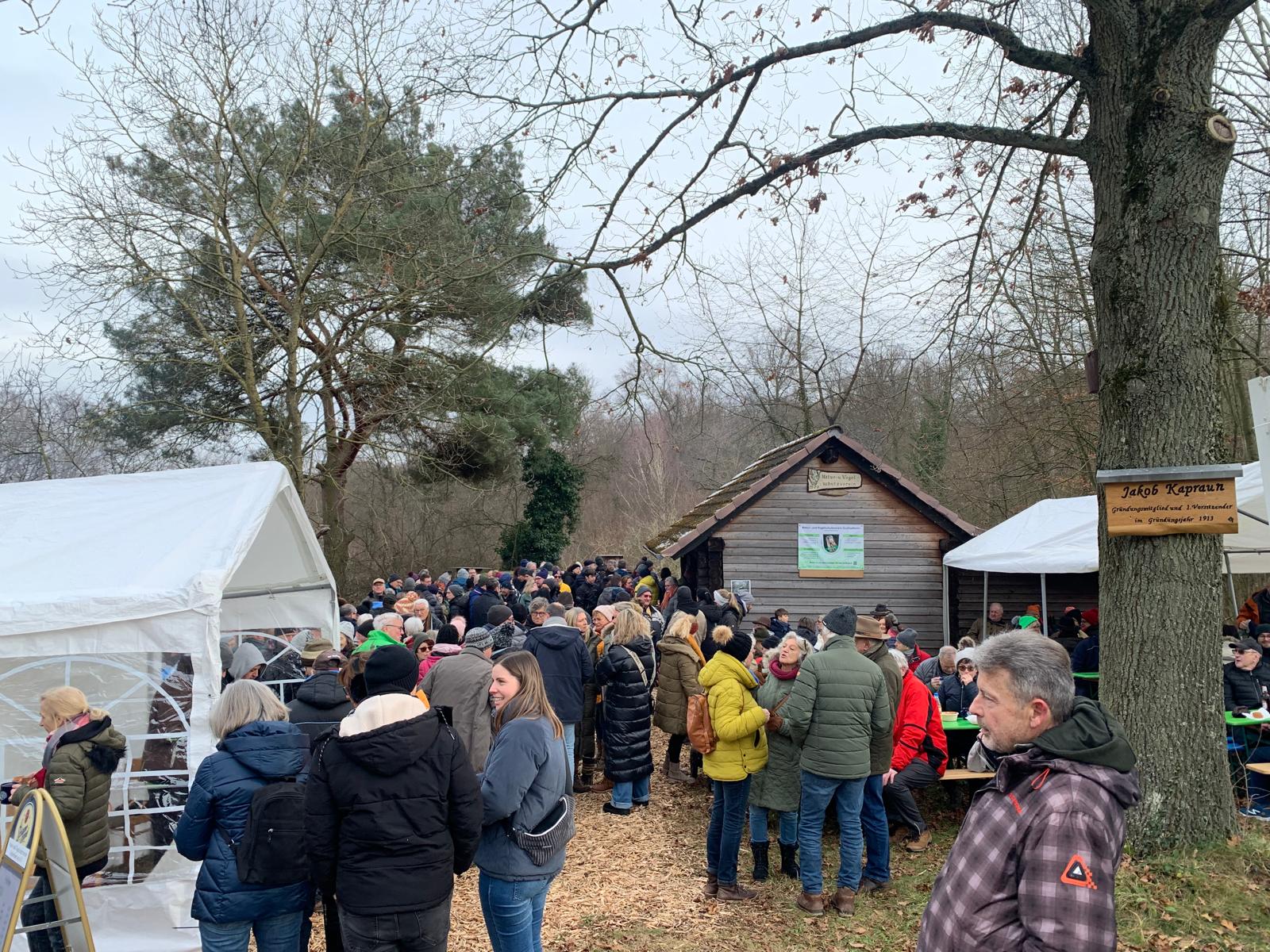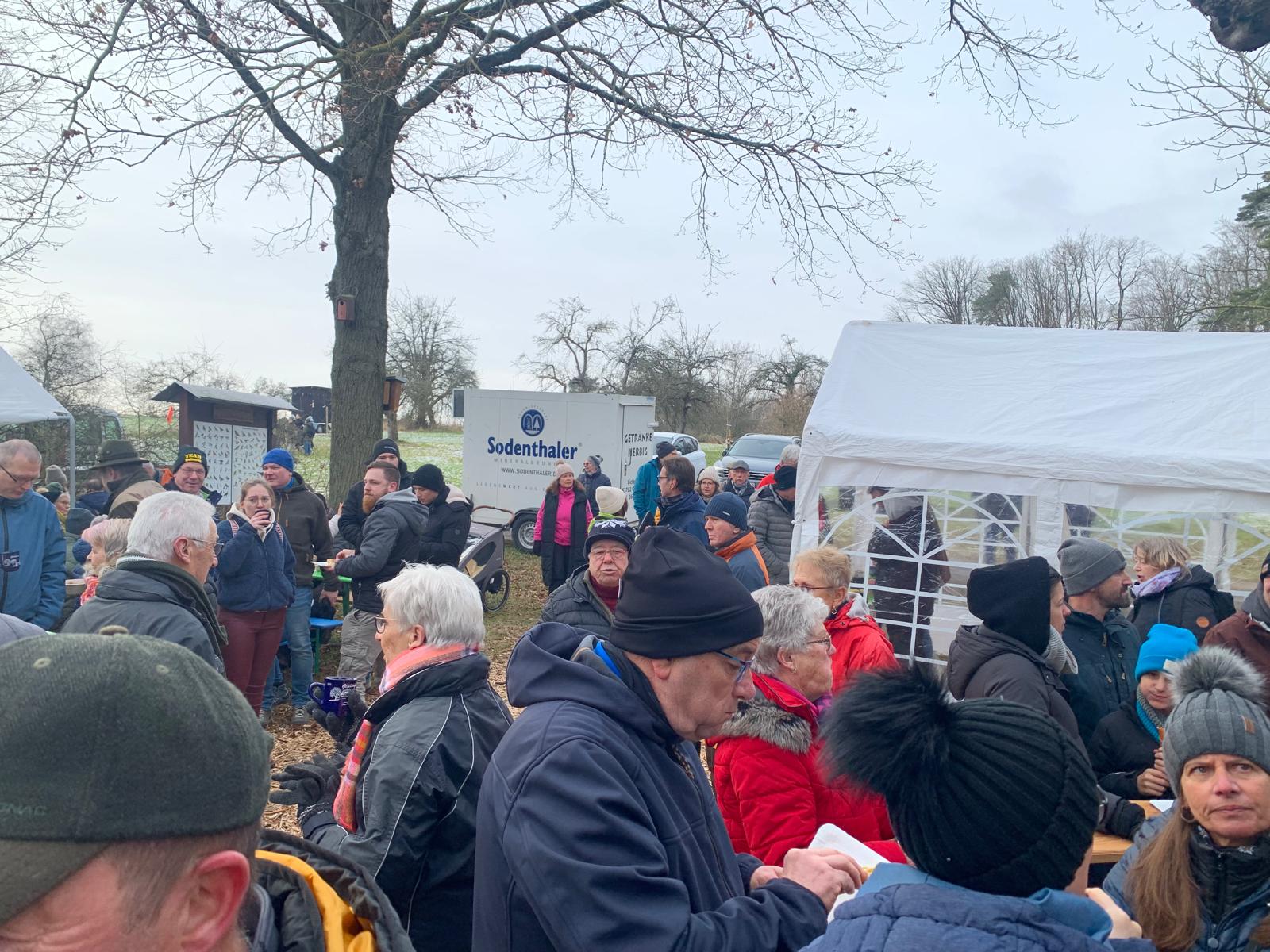 Aus Nah und Fern kamen wieder, wie schon seit über 50 Jahren, zahlreiche Besucher an die Blockhütte des Natur- und Vogelschutzvereins Großostheim im schönen Oberwald. Kalte Füße ? Kein Problem! Bei heißem Glühwein, Zimtler und Sliwowitz wurde jedem schnell wieder warm ! Und für den Hunger nach der Wanderung gabs wieder deftige Fleischwurst oder eine leckere Gulaschsuppe aus der historischen „Gulaschkanone“. Sogar die politische „Prominenz“ war dieses Jahr wieder da. Die letzten Besucher traten erst zu Beginn der Dämmerung den Heimweg an.