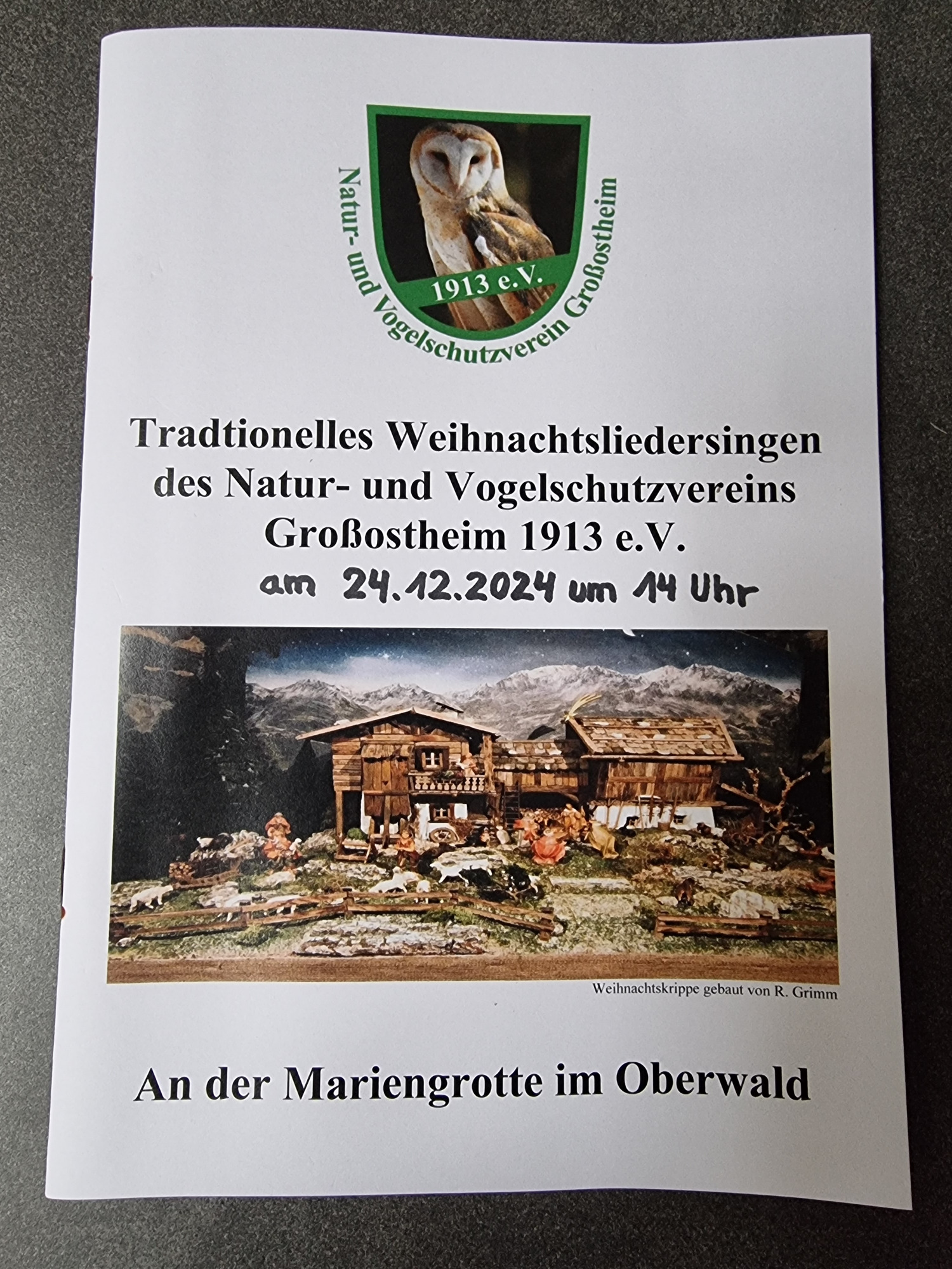 Die zündende Idee zum gemeinsamen Weihnachtsliedersingen hatte 1980 erstmalig unser ehemaliges Vereinsmitglied Ferdinand Petermann. So kamen am 24.12.1980 erstmals ca. 30 Mitglieder des NVV Großostheim bei klirrender Kälte und Schnee im Lengtal zusammen, um sich auf Weihnachten einzustimmen. So ging es weiter und nach 4 Jahren glaubte man das Weihnachtsliedersingen mit Sologesang und Musik weiter ausgestalten zu müssen. Allerdings zeichnete sich schnell ab, dass die teilnehmenden Frauen, Männer und Kinder doch selbst mitsingen wollten. Ferdinand Petermann stellte deshalb ein Heft zusammen, in dem viele alte Weihnachtslieder mit allen Strophen verzeichnet waren. Denn oft kannten die jungen Leute nur den Anfang oder die erste Strophe der Lieder. Dieses Heft wurde zwischenzeitlich mehrfach durch den Verein aktualisiert und neuere Weihnachtslieder mit aufgenommen. So ist der Verein dem bis heute treu geblieben am Heiligabend in der Stille des Waldes an der Mariengrotte in einfacher Weise ein Weihnachtsliedersingen abzuhalten. Das ist bis heute auch so geblieben und der Teilnehmerkreis ist über die Jahre immer weiter angewachsen. Mittlerweile fand schon zum 42. Mal, wie seit Jahren, am 24.12. eine regelrechte Sternwanderung auch aus den umliegenden Gemeinden an die Mariengrotte im Lengtal statt. So romantisch wie beim ersten Mal wurde es die letzten Jahre nur noch selten, denn es hatte bisher nur noch einige Male geschneit.