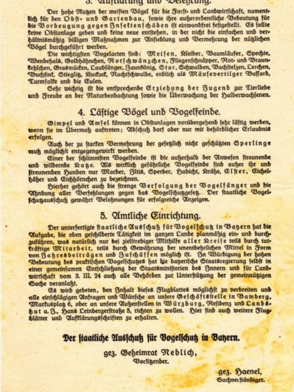 Allerdings ging es erst 1919 mit den Aktivitäten so richtig los, denn auch die Naturschützer mussten in den Ersten Weltkrieg einrücken. Man begann unter der Federführung von Jakob Kapraun 100 Nistkästen zu zimmern und im Ober- und Unterwald aufzuhängen. Die Betreuung der immer wieder erneuerten Kästen, in denen z. Bsp. Meisen, Fliegenschnäpper oder Fledermäuse Unterschlupf für ihre Brutzeit fanden, gehört heute noch zu den Hauptaufgaben der Mitglieder.